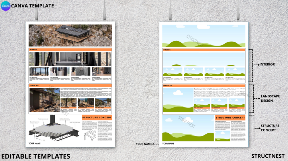 This Canva template is perfect for architecture students, architects, and anyone in need of a professional and visually appealing design presentation board.