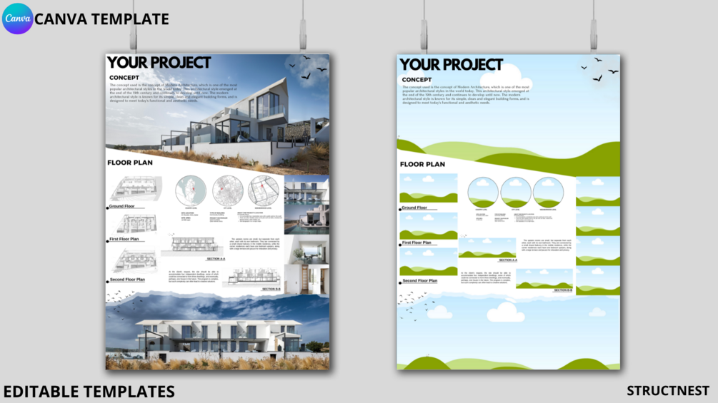 This Canva template is perfect for architecture students, architects, and anyone in need of a professional and visually appealing design presentation board.